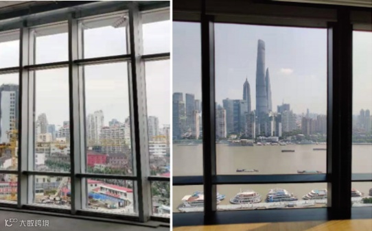 玻璃不落地效果(左)、玻璃落地效果(右)