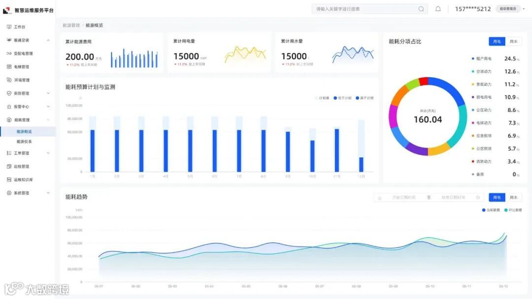 智慧运维平台通过监测采集水、电、气能源消耗,分类分项汇总能源使用情况,诊断主要用能设备能效,实现建筑能耗、企业用碳的精细化管理,分析优化能源使用,减少建筑能耗降低运营成本。