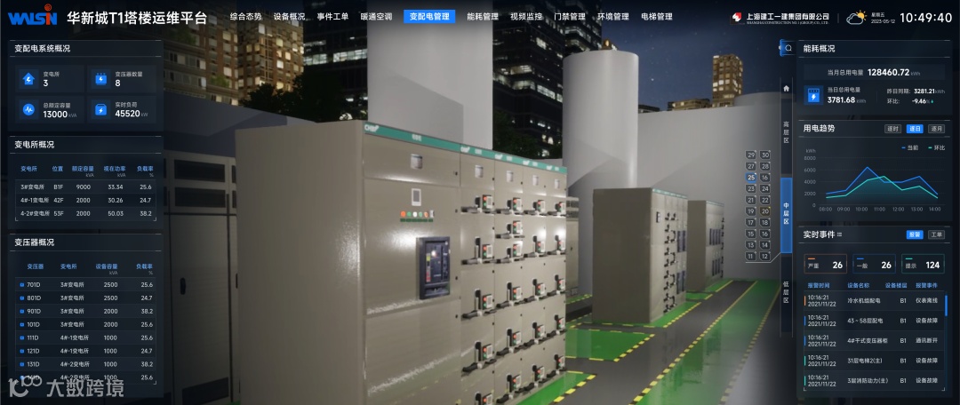 变配电是项目运行的关键设施,运维团队综合运用传感器、物联网、视频及数字孪生技术,实现了机房24小时无人值守,将三个分散于不同楼层的变电所进行统一管理。在监控中心大屏和手机上可以实时监测各变压器及配电回路的运行状态,有效地节省了运维人力成本,提升了变配电所的运维效率和故障响应速度。