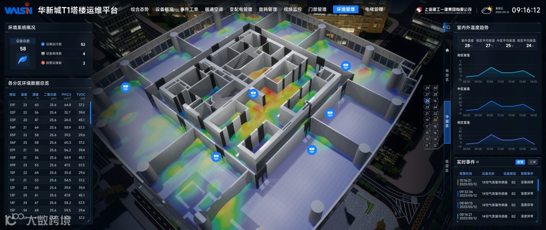 通过安装建筑内的空气质量传感器,对空气温度、湿度、TVOC、颗粒物(PM2.5/PM10)、甲醛、二氧化碳等进行监测并提供空气质量监测报告,展现建筑内部温度云图提升可视化效果,对办公环境的空气质量进行有效管理。