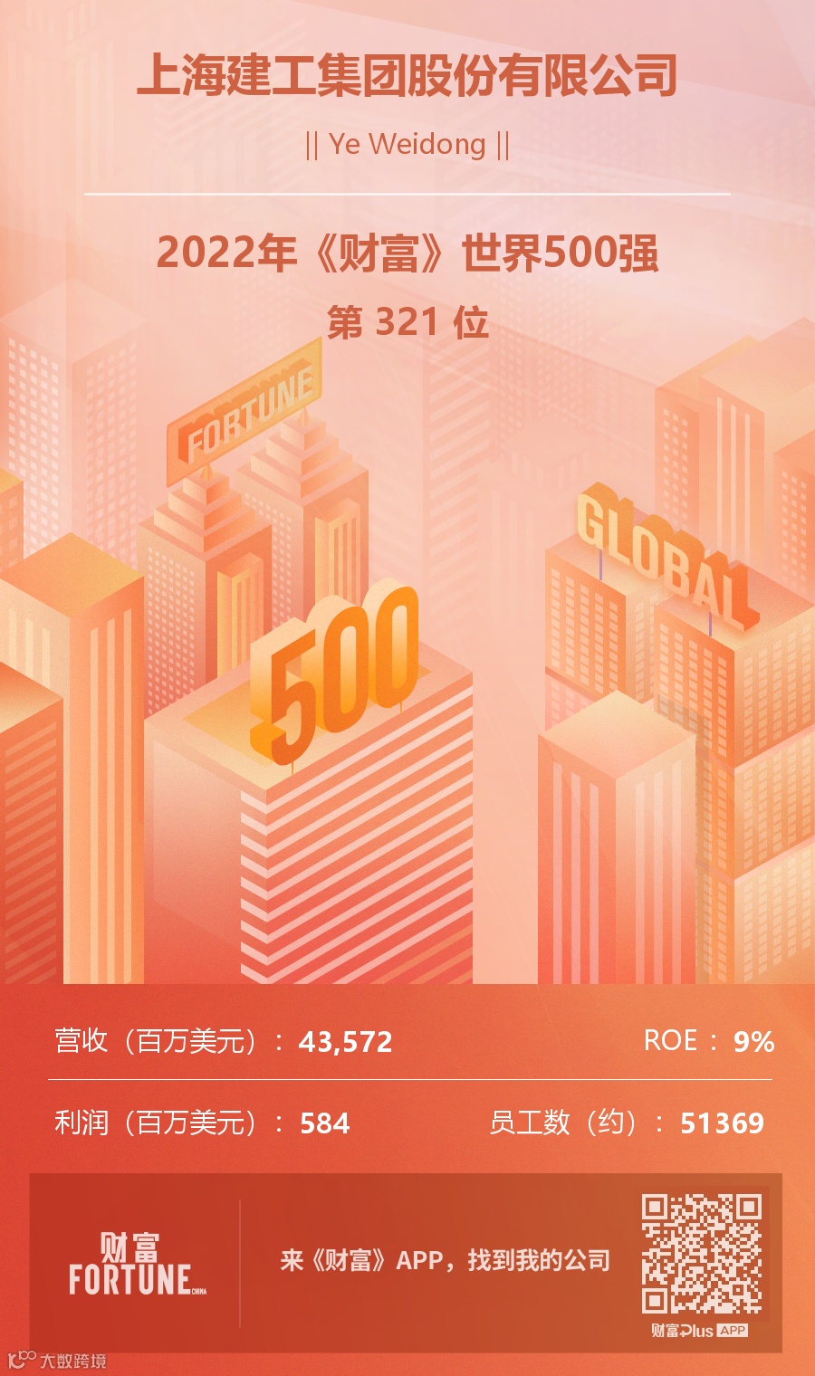 8月3日,《财富》公布2022年世界500强排名,上海建工集团股份有限公司以435.72亿美元(2810.55亿元人民币)营业收入,位列第321位,较去年上升42位。