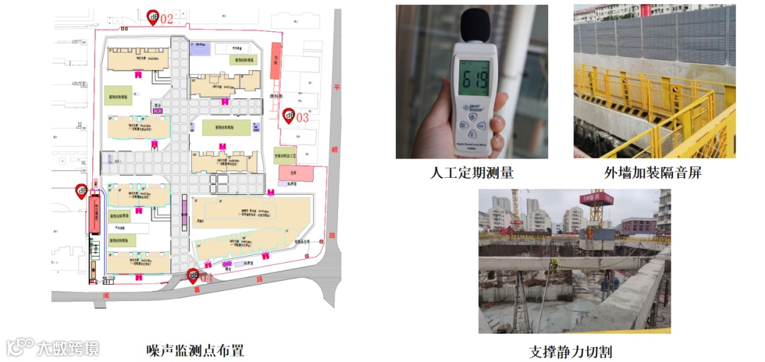 考虑到施工对周边居民生活的影响,项目部在施工中着重提高了对噪声、光污染、扬尘等控制。项目部设置降尘喷雾系统,减少扬尘对周边居民的影响;合理布置噪声源,尽量布置在远离居民楼一侧,所有灯源均设置灯罩,控制光线照射范围。