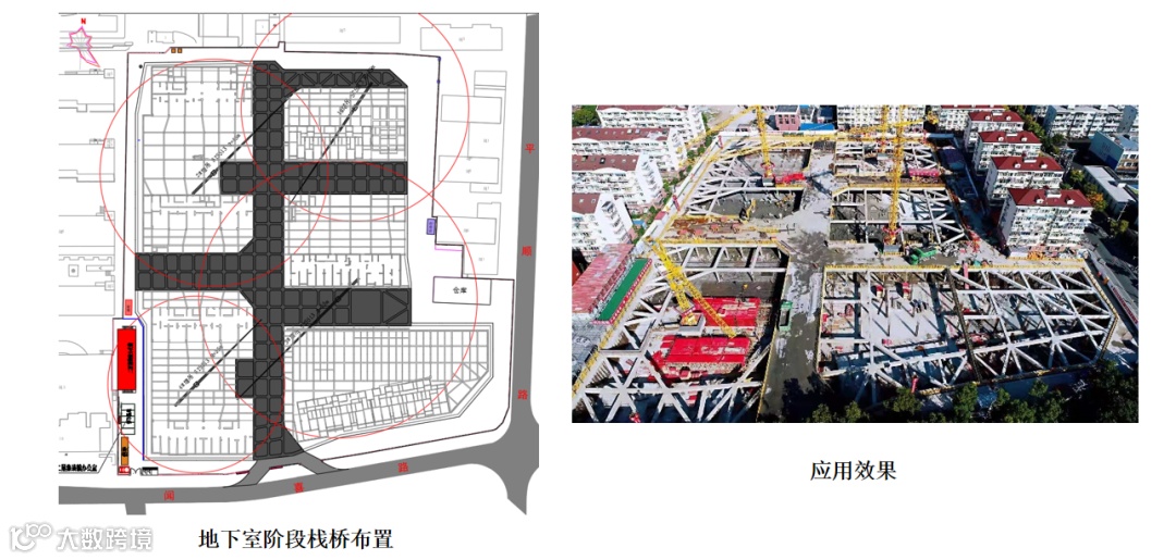 地下室原来无栈桥板的工况下,只能由北向南退挖,且由于连续开挖风险较大,不得不在前一块底板完成后开挖下一个工作面,使得工作效率低下,施工风险增加,基坑施工增加栈桥后,采取跳仓连续开挖的施工方式,一不耽误工期,二增加了基坑的安全系数,可谓一举两得。栈桥避开主体结构的设计,也为后续基坑到上部结构施工的转换做足准备,上部结构施工可跳开其他区域单独进行,保留的栈桥作为施工便道,其他区域基坑施工和当前区域上部结构施工互不影响,利用栈桥这一“空中走廊”,作为施工区域遍地开花的前提和保障。