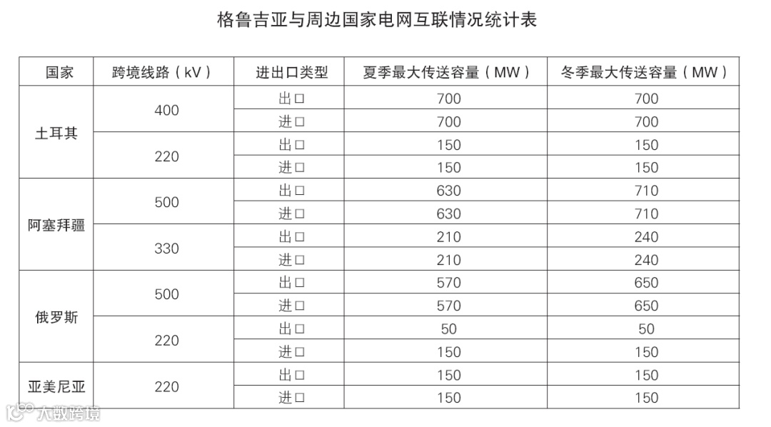 格鲁吉亚电网与土耳其、阿塞拜疆、俄罗斯及亚美尼亚实现互联互通,电力进出口渠道畅通,交易活跃稳定。电量交换主要通过跨境的500kV、400kV、330kV、220kV架空线路开展,详见下页表。