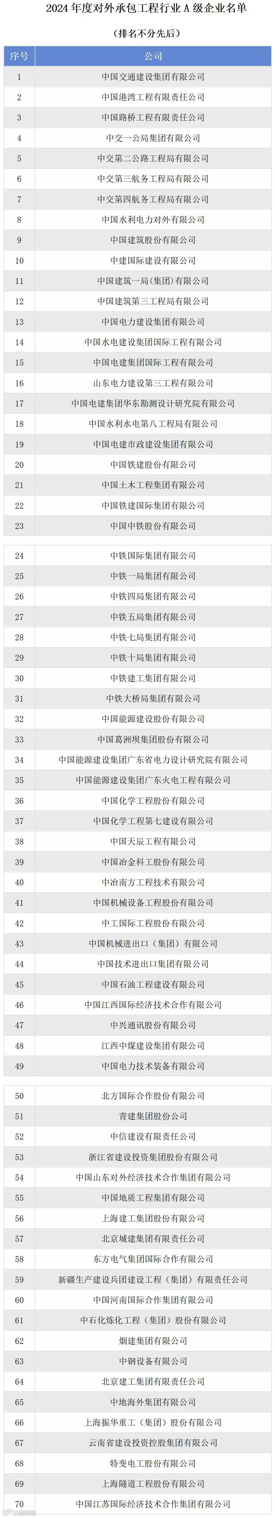 根据《对外承包工程企业分级框架标准(试行)》,我会完成了2024年度对外承包工程行业A级企业评定工作。经承包商会行业规则委员会各成员单位审议通过,现将2024年度对外承包工程行业A级企业名单进行公示。