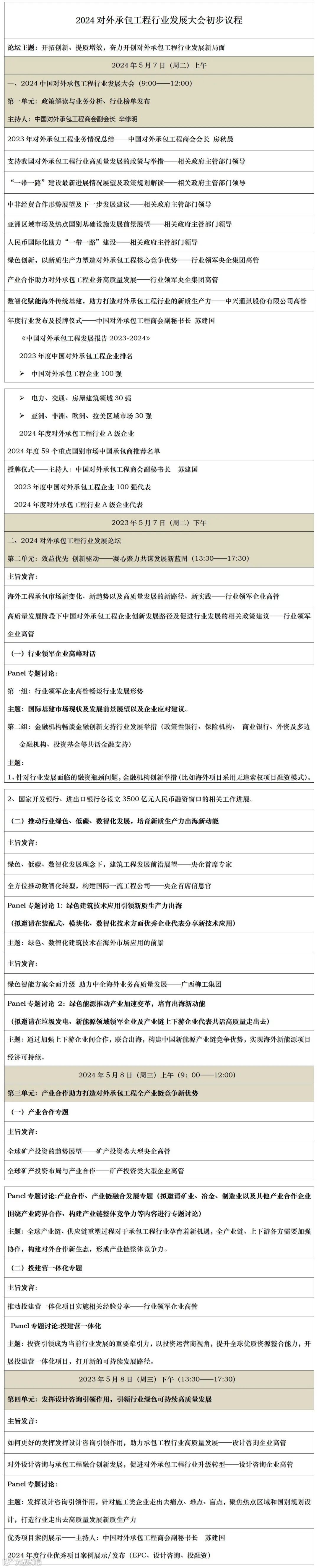 过去的2023年,我国对外承包工程行业在复杂严峻的外部环境影响下,仍然实现了逆势增长,成绩难能可贵。展望未来,全球基础设施建设需求在经济复苏、绿色转型、数智化发展的推动下正在持续扩大,第三届“一带一路”国际合作高峰论坛提出的高质量共建“一带一路”八项行动正在逐步落实,行业即将迎来新的发展机遇期。但我们也要看到,在世界百年未有之大变局加速演进的大环境下,行业发展仍处于爬坡过坎的转型期,传统发展模式遭遇瓶颈,市场集中度越来越高,同质竞争日趋激烈,市场隐性风险持续扩大,也需要全行业思考探寻妥善应对举措。在此背景下,我会拟于5月7-8日在北京丽泽厦航嘉年华酒店举办“2024对外承包工程行业发展大会暨2024中国对外承包工程行业发展论坛”,认真总结发展经验,积极探索高质量发展道路。