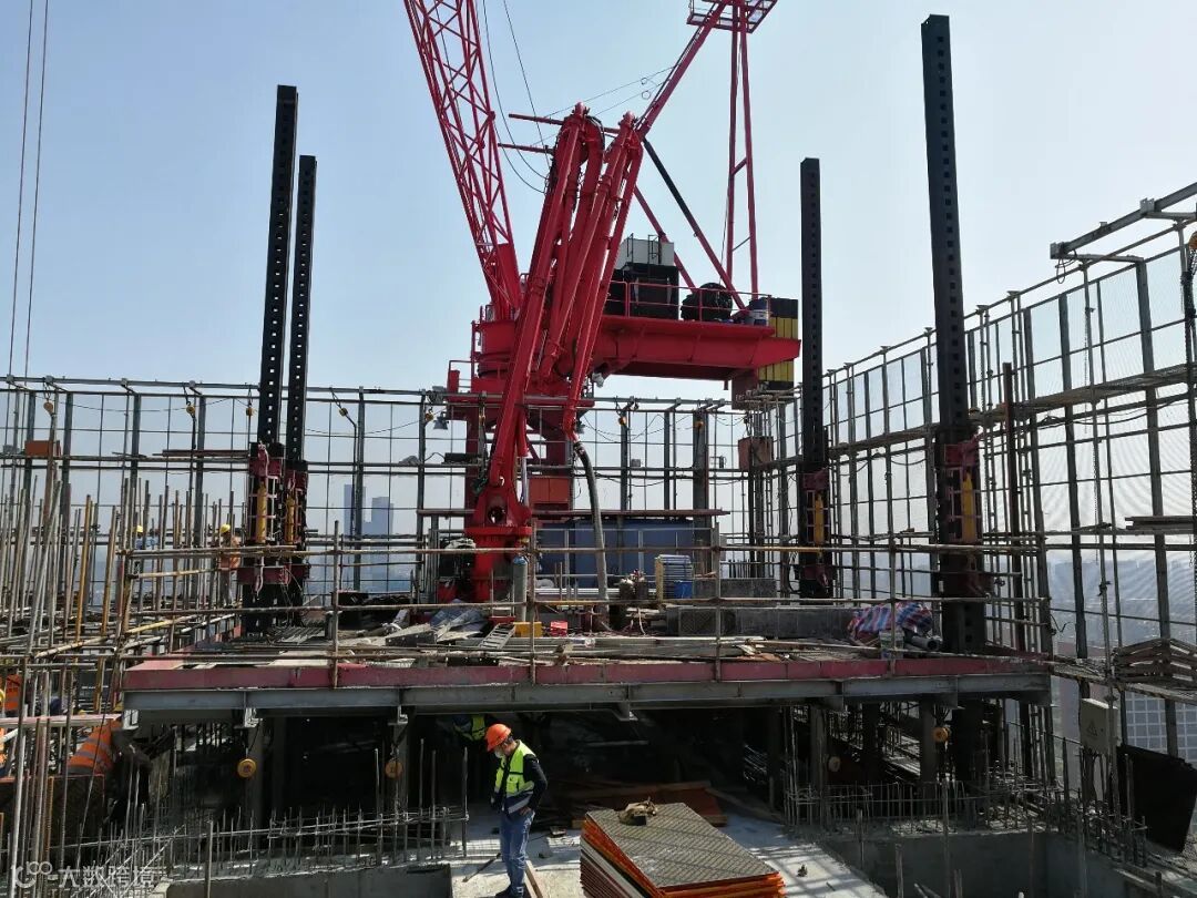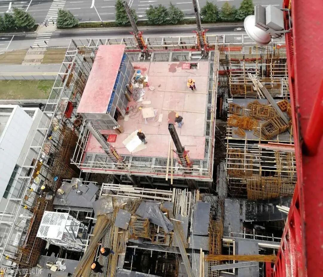 苏河湾办公楼项目地上42层,地下3层,结构总高度为209.75米,地上建筑面积10.3万平方米,塔楼核心筒范围内均采用铝模板施工。核心筒的模板脚手首次采用小钢平台组合式整体模架体系,与其相邻的核心筒外墙悬挂施工作业用脚手架,核心筒内布置施工电梯直达施工作业面,极大便利了施工人员上下。在小钢平台上布置了混凝土布料机,便于核心筒结构混凝土施工,该钢平台模架体系既发挥了整体爬升钢平台的优势,又实现了水平梁板结构与竖向墙体同步施工。项目中采用的小钢平台装备体系,体现了这套装备体系在安全性、标准化、高适应性等方面的技术优势,奉献了高质量的精品工程,受到业主及社会各方的广泛赞誉。