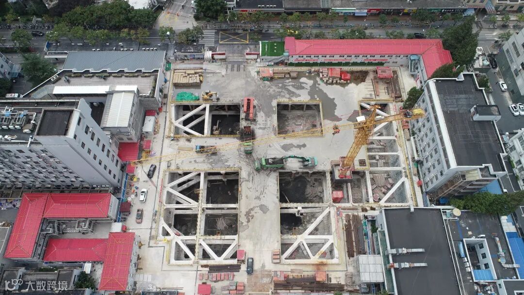 项目位于岳阳医院院内,周边环境复杂,场地范围三面紧邻院内急诊楼、医技楼、中医临床基地以及职工食堂,其中最近的中医临床基地距离基坑边缘仅有3.2米,基础老旧;且地下三层基坑开挖深度大、周期长,施工过程中要对这些建筑物的变形控制难度较大。针对这一不利因素,总承包项目部多次踏勘现场,查阅技术资料,综合考虑后决定对院内临近建筑采取预加固措施。基坑土方开挖前邀请权威专家对周边建筑物在施工过程中的沉降及变形进行安全评估,并出具指导性意见,最终采用了对中医临床基地内全部原基础新增静压锚杆桩加混凝土筏板,其他建筑角部换梁加局部锚杆桩等一系列加固措施。在基坑施工过程中定期邀请第三方专业房屋检测单位对上述临近建筑物进行沉降及变形测量,保证建筑物的安全稳定。
