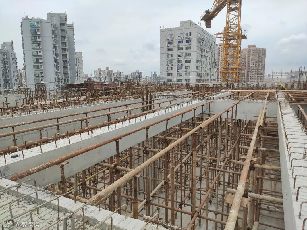 门诊综合楼建筑总高度为58.4米,上部采用装配整体式框架结构,包含现浇混凝土、PC构件及大跨度预应力梁,结构施工工序繁多且互相穿插,对协调管理现场众多施工班组完成施工进度目标带来了很大难度。因场地受限仅能安装一台塔吊,调配塔吊成为现场施工的关键。项目部综合分析,根据现场工序的主次关系,将PC构件的吊装工作主要安排在晚间进行,白天则进行盘扣外架、钢筋、模板及支撑架等材料吊运工作,在现浇结构的工序中穿插进行PC施工。同时项目部积极配合业主和代建,加强现场管理与协调,优化施工方案,严把质量关,保证主体结构达到“上海市优质结构”标准。