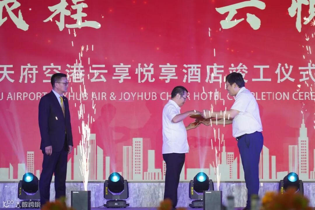 上海建工一建集团四川公司总经理邹锋与四川省机场集团飞行区工程部书记王跃、天府机场云享悦享酒店管理公司总经理胡晓波完成钥匙移交仪式。