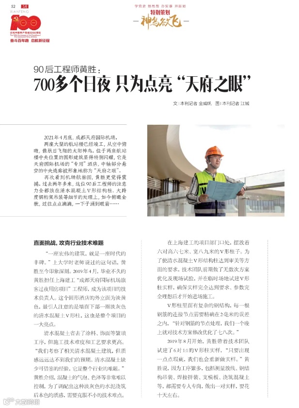 顺利攻克异型劲性清水砼V型柱施工技术,使原本需要近两个月的施工周期缩减至20多天。项目部还成功申请专利“异形清水砼结构钢模板及施工方法”及“一种组合玻璃钢混凝土模板制作技术”。项目工程师黄胜被成都市党委机关刊物《先锋》专题采访报道。