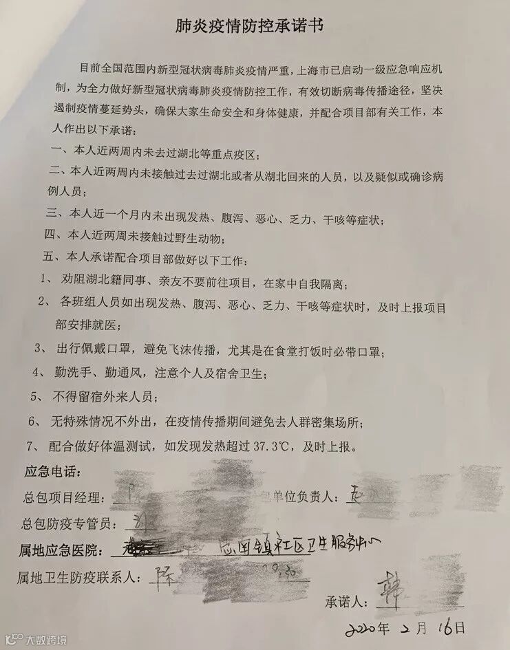 疫情期间,开工项目必须做好各项防疫工作,坚持“三个全覆盖、三个一律”坚决切断传染源、阻断传播途径。为此,项目团队在各级单位文件精神引领下,制定了一系列措施:确定项目防疫工作小组成员,积极筹备防疫物资并建立防疫物资发放台账;详细排查务工人员来源地,建立一人一档的信息登记手册;建立人员出入申报、登记制度,并发放项目出入证。