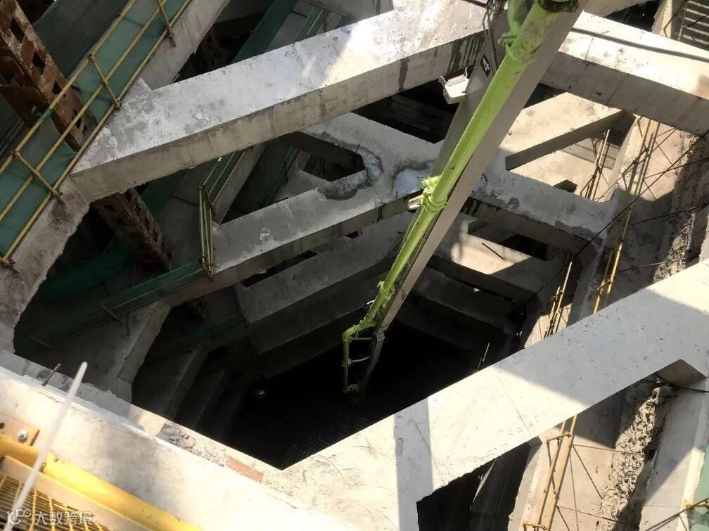 第三,主楼深基坑大体积混凝土浇筑难。塔楼底板厚2.6米~6米。如此厚且大体量的混凝土进行一次性浇筑,需要防止混凝土因水泥水化热引起的温度应力裂缝,这也成为技术难题之一。