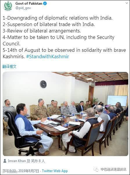 巴基斯坦总理办公室推特账号7日称,这一决定是在巴基斯坦国家安全委员会(NSC)会议上做出的。会议决定:降级与印度的外交关系;暂停与印度的双边贸易;审查双边安排。将此事(印度废除克什米尔地区特殊地位)提交给包括安理会在内的联合国。