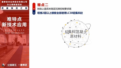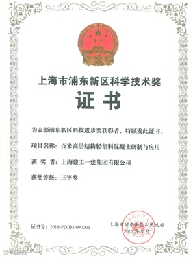 国泰君安证券股份有限公司办公楼新建项目下方为地铁13号线区间隧道,为减少项目建成后建筑物的沉降对地铁影响,结构设计要求塔楼2层以上楼板须使用LC30轻集料混凝土。施工过程中公司通过科研攻关,研制密度为17kN/m³的轻质高强轻集料混凝土,满足了超高层结构的工程需要,并一次性泵送高度到100米,创造上海首次规模化应用新高度。国泰君安证券股份有限公司办公楼新建项目《百米高层结构轻集料混凝土研制与应用》科研项目荣获上海市浦东新区科学技术奖三等奖。