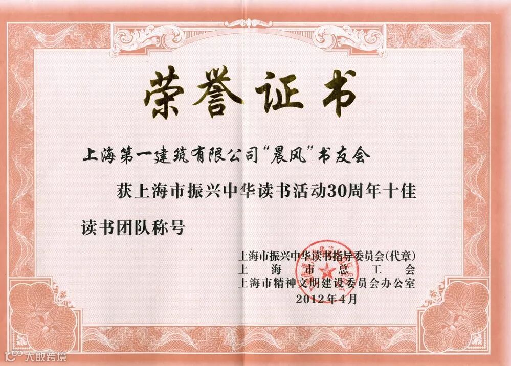 十几年来,在会员的共同努力下,晨风书友会获得了“2012年度上海建工集团特色团建工作项目”、“上海市振兴中华读书活动30周年十佳读书团队”、“2018年度上海建工集团团建特色工作项目”等荣誉称号。