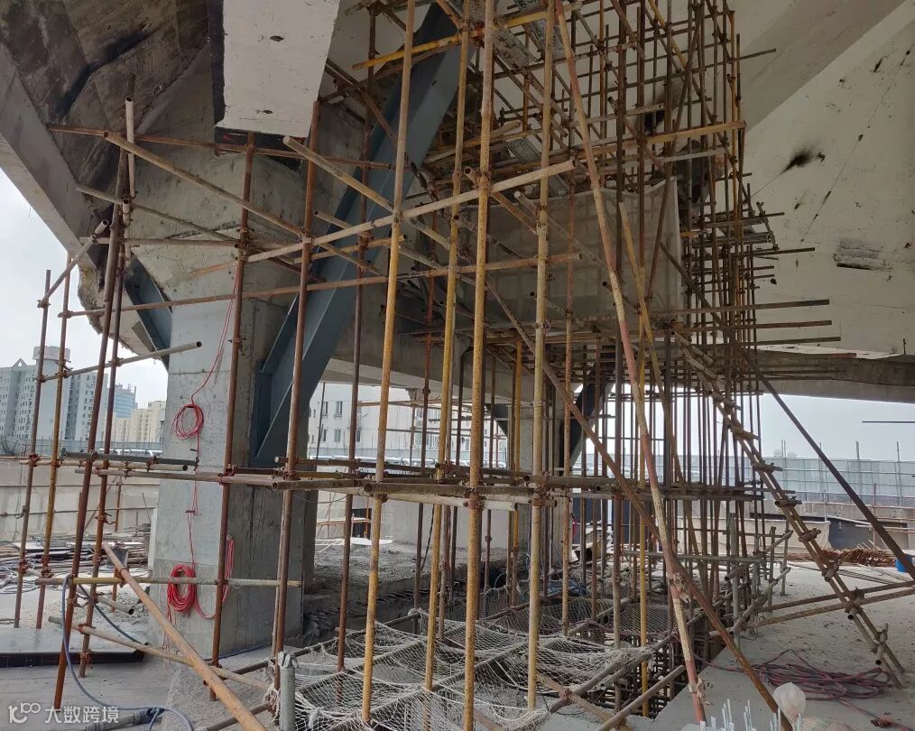 整个置换过程,巧妙的采用了加大截面分段施工、顶部增加柱托及钢梁斜撑、并以高位浇筑,低位封口的施工方法,以达到“压实”的效果,柱顶更是采用了早强+微膨胀+自密实混凝土,保证了这一关键节点的施工质量。