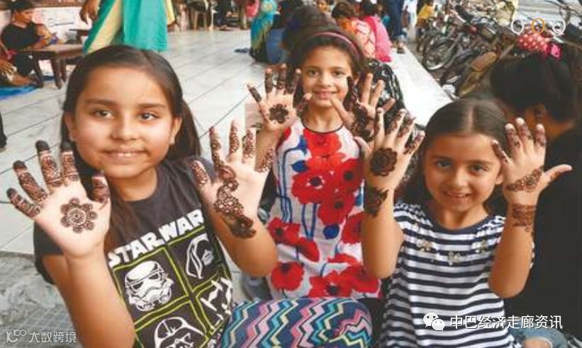 女孩子们在手上画上漂亮的彩绘图,庆祝开斋节