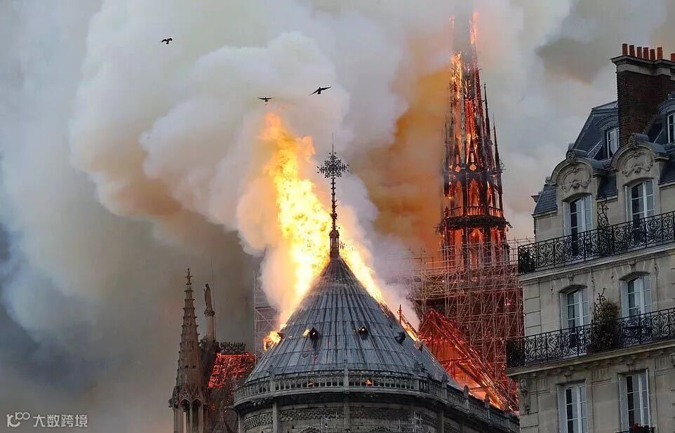 大火最后致使巴黎圣母院顶部的塔尖倒塌