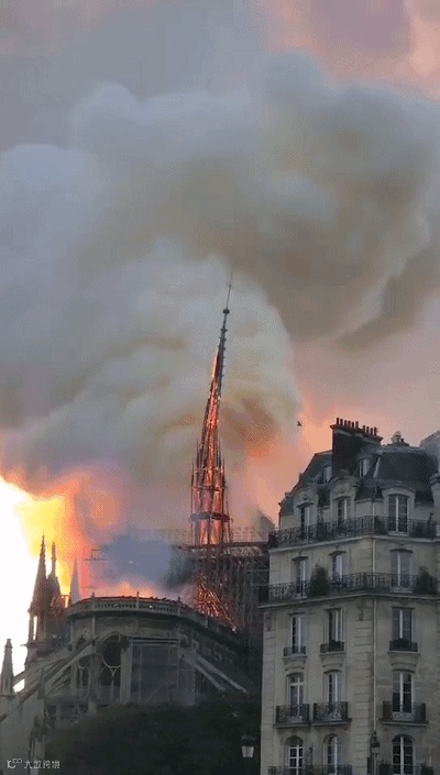 大火中的巴黎圣母院,塔尖折断的一瞬间