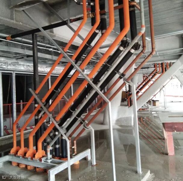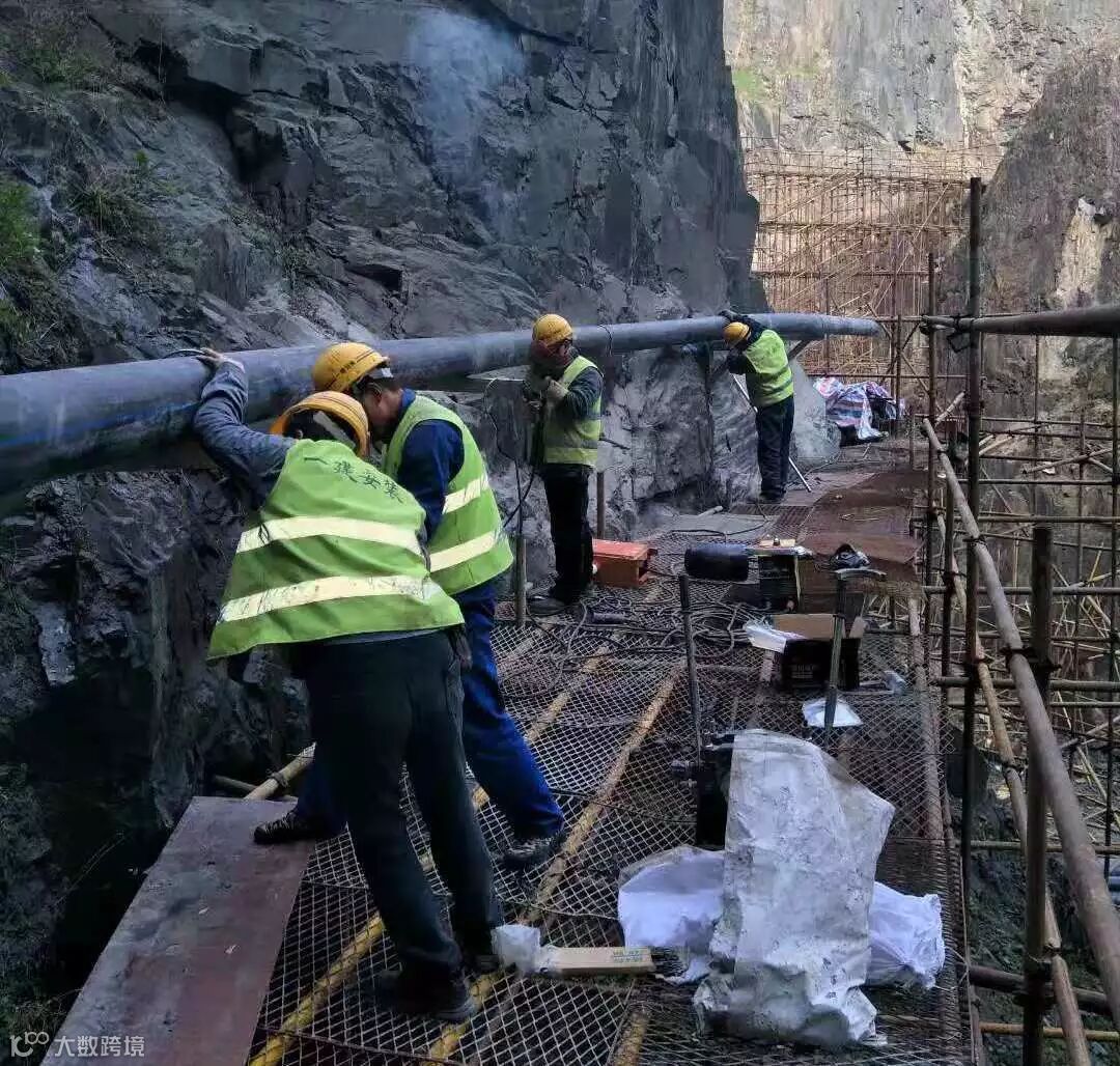 支架的支撑使得崖壁上的水处理管可以顺利安装,可正当项目团队打算开始安装工程时,又遇到了新的麻烦。在原方案中,坑上水处理机房出水管沿“之”字形栈道到坑底,管道采用无缝钢管法兰连接二次镀锌安装。但在实际施工中,由于崖壁不规则,只能在栈道上预制安装管道,管道安装完毕后需要拆除送至镀锌厂二次镀锌,再重新安装。这个过程费时费力,会极大地拖慢工程进度。项目团队开动脑筋,想出了一个漂亮的解决方法:将“之”字形栈道上面的水处理立管改在室内排水主管井安装,顺利化解难题。