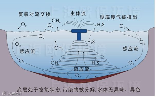 针对迅速繁衍的藻类植物会使湖水发绿发臭,对水质造成极大破坏等问题,项目团队在景观湖内安装了7台超大流量提水曝气机,提水曝气机如同人的肺一样循环着空气,它们将废气从湖底带出,将新鲜的氧气输入湖底,改善水体溶氧状态。