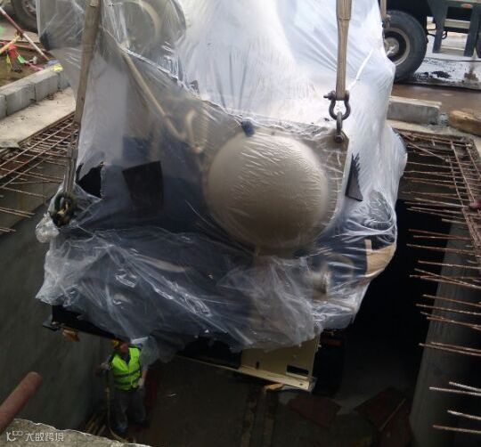大型设备位于坑外B1层,预留吊装孔离道路距离较远,汽车吊需架设在地下车库顶板上进行作业,但是楼板面承重有限制,项目团队会同公司技术专家经历近2个月的反复计算研讨,最终冷冻机、锅炉和发电机一次吊装完成,酒店“心脏”精准安装到位。