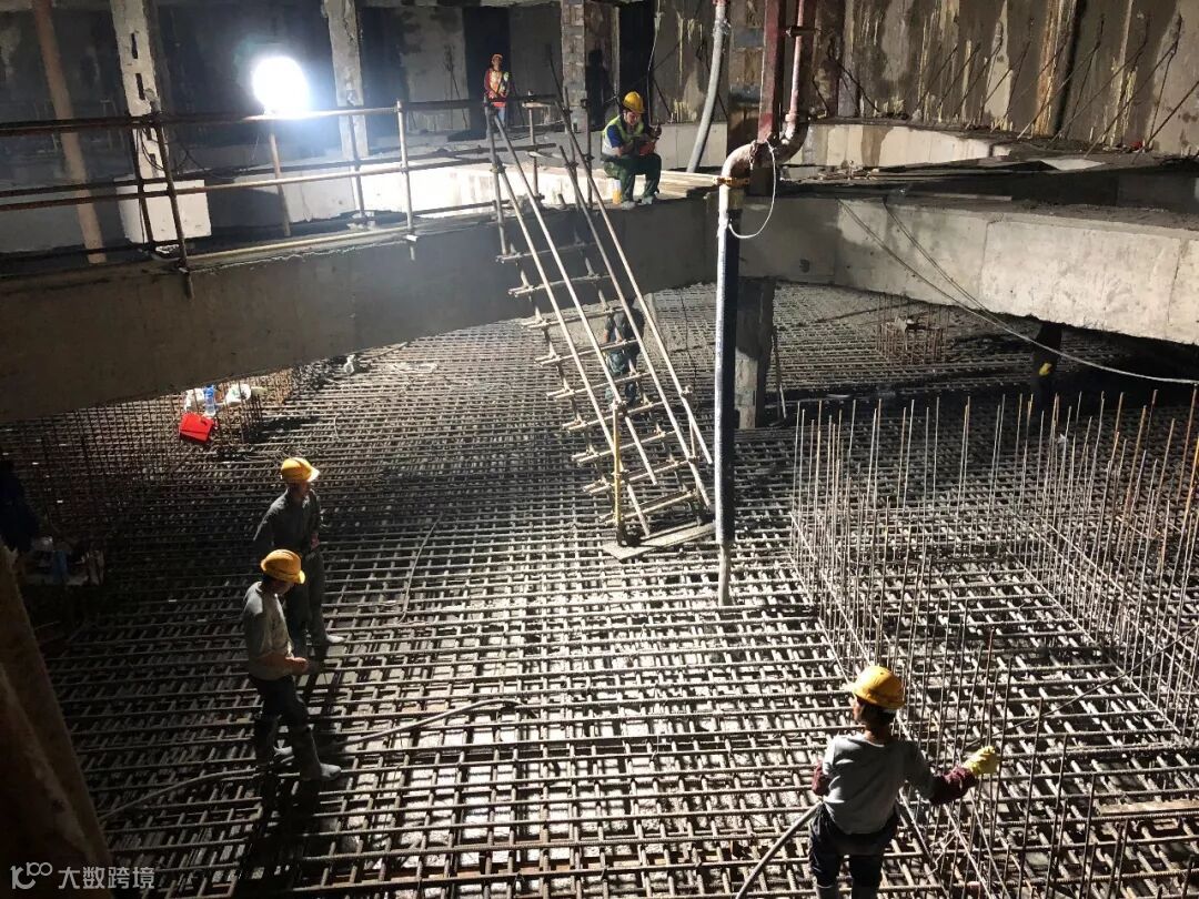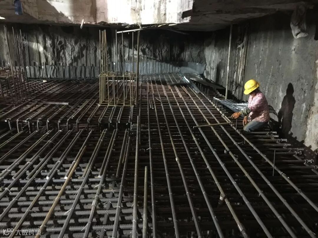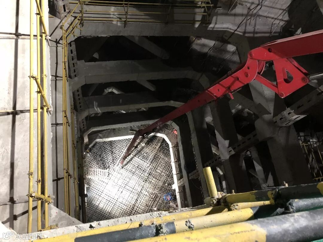4-3区基坑底板面积近5000平方米,普遍开挖深度达到32米,局部深坑超过36米,共7道钢筋混凝土支撑,整个基坑挖土方量近16万方。凭借上海建工强大的“执行力基因”,项目部在开挖期间做到了日均出土2000方,底板施工期间每日平均钢筋绑扎150吨,最终顺利完成了4-3区底板超过9000方混凝土浇筑任务。