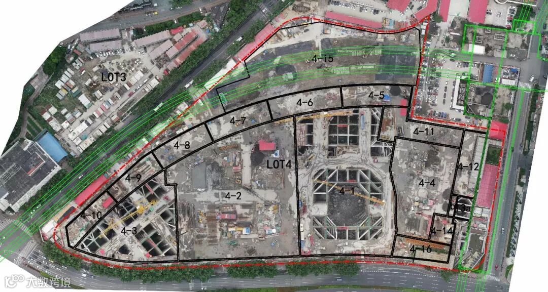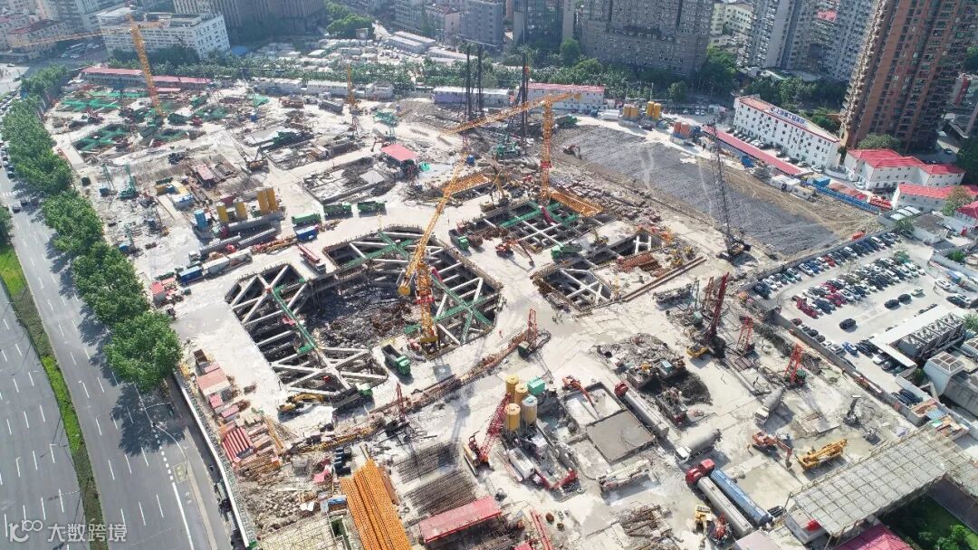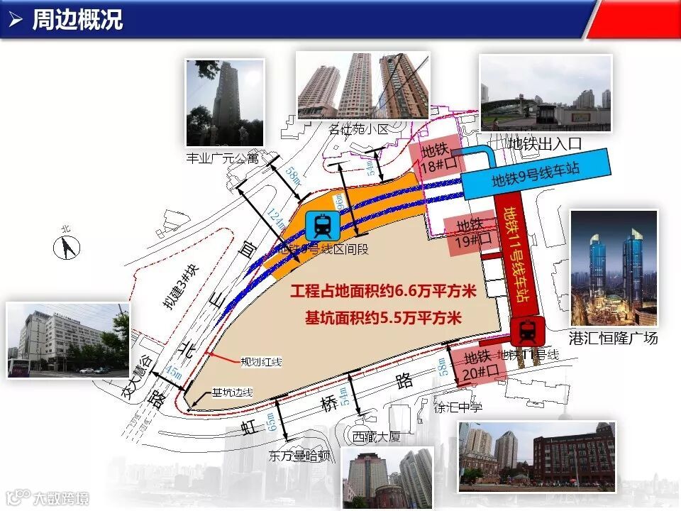 徐家汇中心项目周边高楼林立,港汇广场、高层住宅等环绕工地四周。同时这里交通繁忙,主干道虹桥路车水马龙,工地附近的公交车站更是聚集了12条公交线路。除了地上可见的复杂环境,本工程还紧贴徐家汇地铁站,1、9、11号线都从此经过,基坑施工受到极大限制。