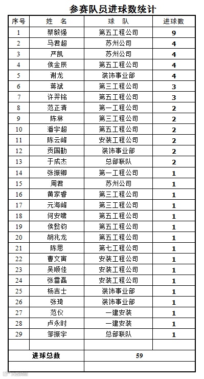 第五工程公司进球的队员是: 蔡毅强(5球)、许羿铭、何安啸