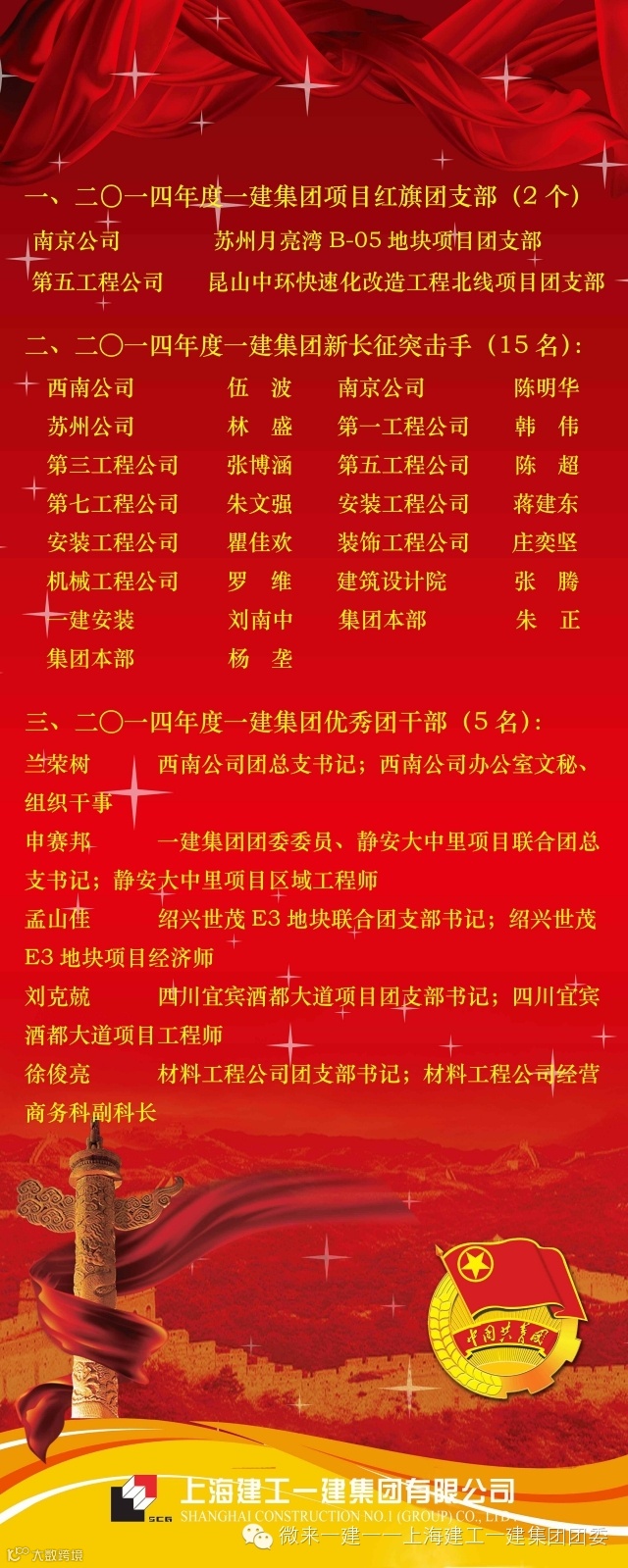 关于表彰二○一四年度上海建工一建集团有限公司 项目红旗团支部、新长征突击手、优秀团干部的决定