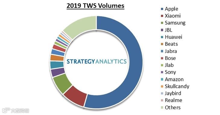 据外媒Strategy Analytics的数据显示,苹果公司的True Wireless Headset真无线耳机在该市场中占据主导地位,出货量占2019年全品牌TWS耳机出货量的一半多,市场份额为54.4%。而其下两个最接近的竞争对手是小米和三星,小米以910万台的出货量(8.5%的份额)领先于三星的740万出货量(6.9%的份额),但均没有达到10%。