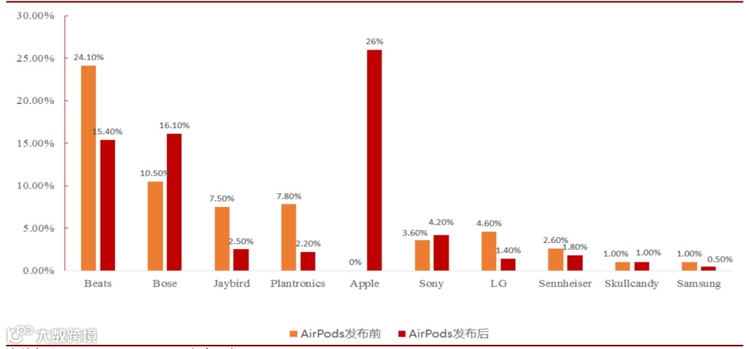 2016年9月,苹果在秋季新品发布会上推出iPhone 7的同时,发布了其首款TWS无线耳机AirPods。毋庸置疑,Airpods是个成功的产品,其在短短一个月时间内就成为美国最受欢迎的无线耳机,消费者满意度高达98%,刷新苹果历代产品记录。根据市场调研机构Slice Intelligence 的数据,Airpods发行短短一个月已占据26%的市场份额,超过Beats和Bose耳机的份额。