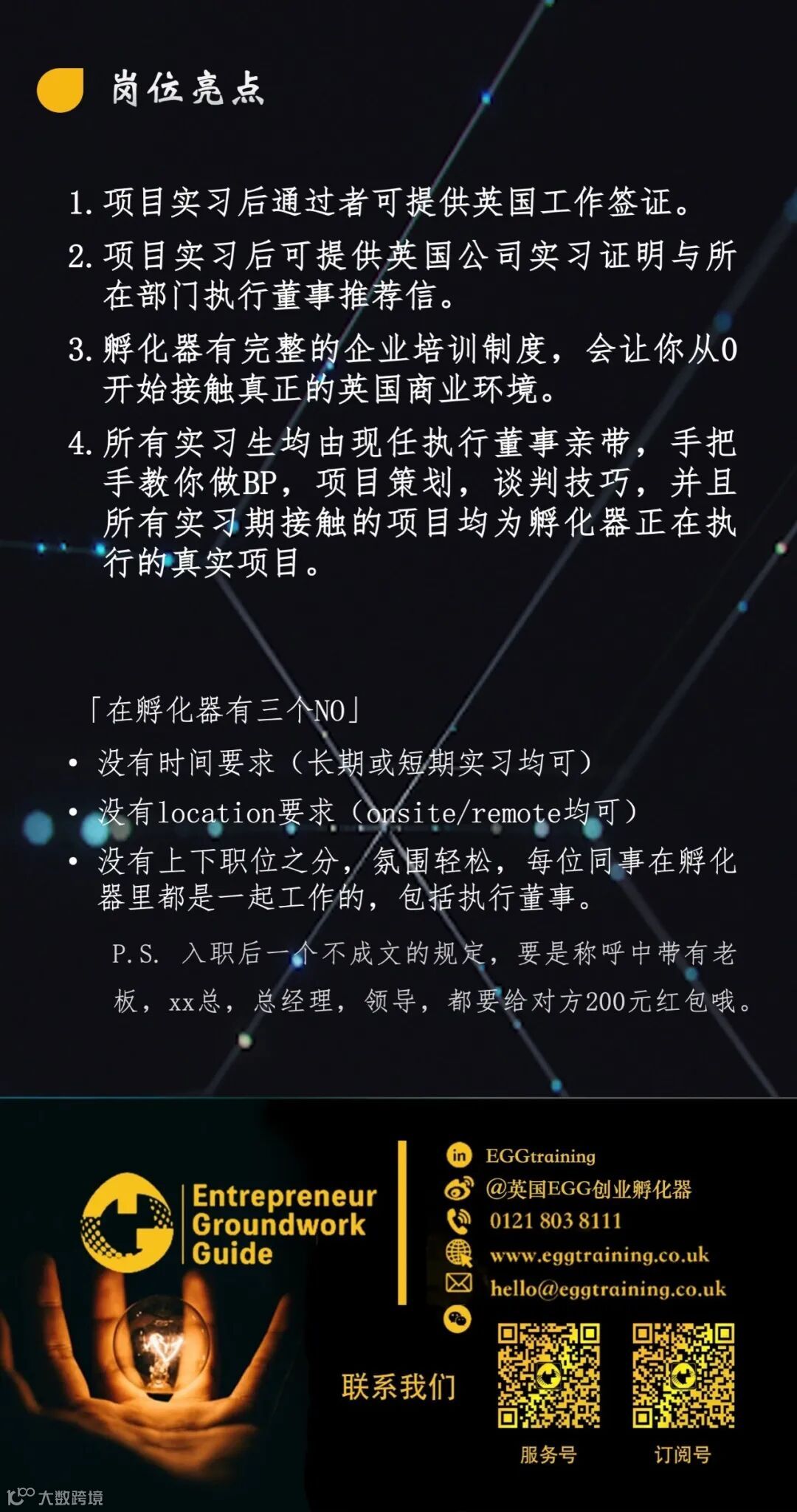 英国EGG孵化器,最具影响力的海外华人创融平台。 英国EGG孵化器成立于英国(UK),是一家以“创业扶持+种子投资”为发展模式的英国创业孵化器,目前英国EGG孵化器已经参投15个英国项目,涉及到中英项目落地20个,共参牵投上亿英镑。