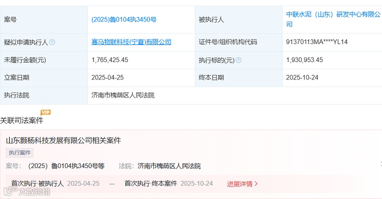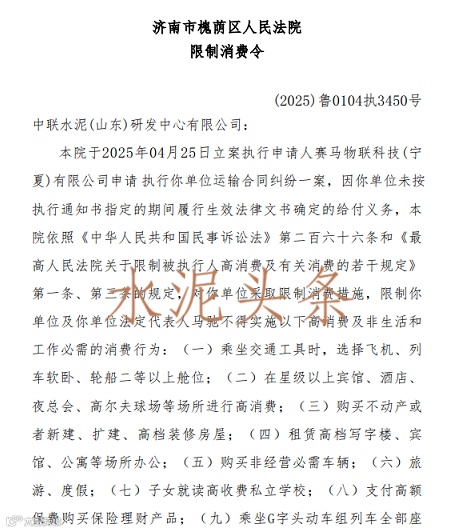 水泥头条消息:根据济南市槐荫区人民法院发布消息,中国建材集团的成员企业中联水泥旗下子公司中联水泥(山东)研发中心有限公司包括法人马驰被限制高消费,限制措施包含不能坐高铁,不能旅游度假等。