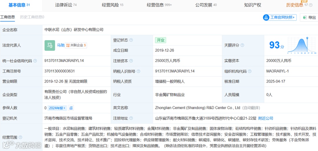 水泥头条了解,中联水泥(山东)研发中心有限公司是中国联合水泥集团有限公司全资子公司,是中国建材集团的成员企业,成立于2019年,注册资金25000万人民币。