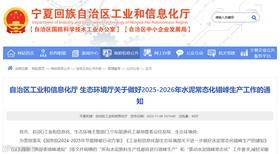 为落实国家节能降碳部署,减轻大气污染治理压力,遏制行业“内卷式”竞争,近日宁夏回族自治区工业和信息化厅、生态环境厅联合印发通知,明确2025-2026年全区水泥常态化错峰生产具体安排,所有水泥熟料生产线均纳入错峰范围。