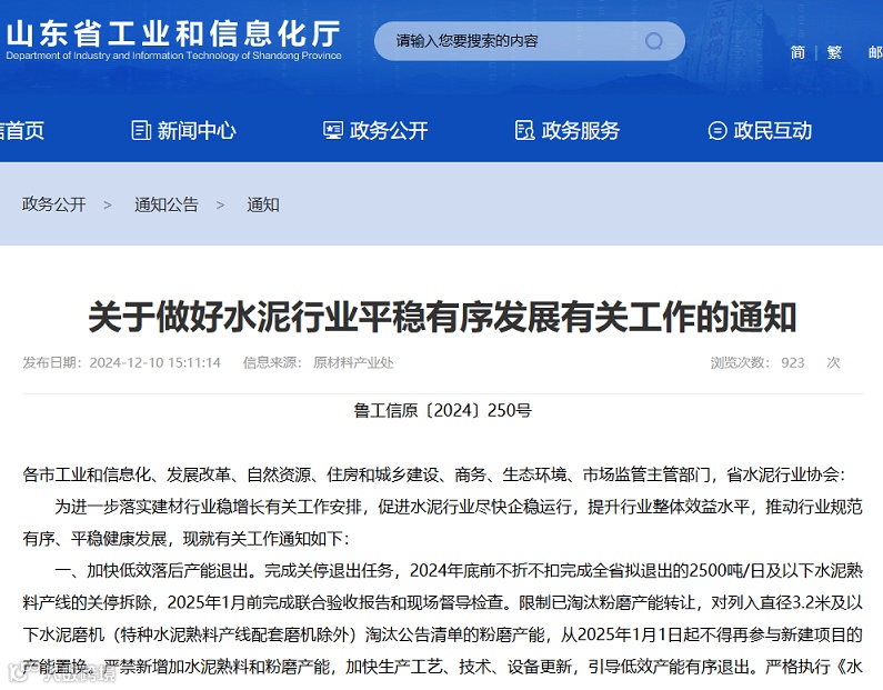 早在2024年,山东工信厅、山东发改委等多部门就曾明确发文要求:加快低效落后产能退出,2024年底之前完成全省拟退出的2500吨/日及以下熟料线的关停退出。