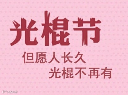 光棍节 Singles' day (11月11日),是流行于中国大陆地区的非官方、非传统节日、非正式娱乐性节日,以自己仍是单身一族为傲(“光棍”的意思便是“单身”)。它起源于网络文化和校园文化,此前也被称为光光节。同时又因为暧昧的男女可以在这一天暗示自己单身,这一天也是众多单身狗为脱离光棍状态而举办交友聚会活动的日子,因此又同时是脱光节(义为“脱离光棍单身的节日”)