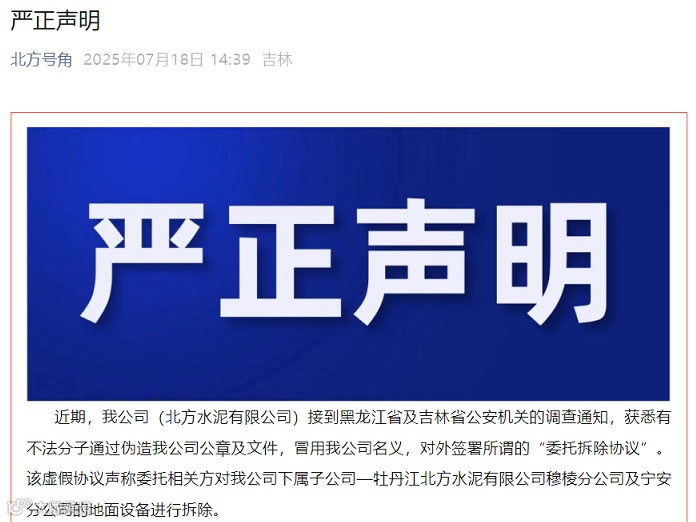 北方水泥有限公司发布消息称:接到黑龙江省及吉林省公安机关的调查通知,获悉有不法分子通过伪造公司公章及文件,冒用公司名义,对外签署所谓的“委托拆除协议”。该虚假协议声称委托相关方对公司下属子公司—牡丹江北方水泥有限公司穆棱分公司及宁安分公司的地面设备进行拆除。