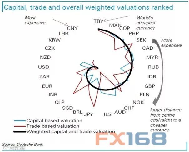 为了弄清楚货币究竟是高估还是低估,德意志银行自创了以资本为基础的评估模型“Cap-PPP”,跟传统以贸易为基础的购买力平价(PPP)模型进行对比。