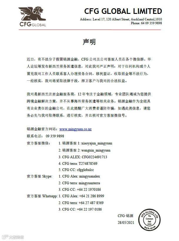 近日,有不法分子假冒铭源金融,CFG公司及公司客服人员在各个微信群、华人论坛等发布新西兰劳务派遣信息,对此我司严正声明:对于任何机构或个人冒充我司工作人员联系客人办理劳务合同,移民签证,收取佣金等不法行为,一经核实,我司将采取法律手段,捍卫客户与我司的合法权益。