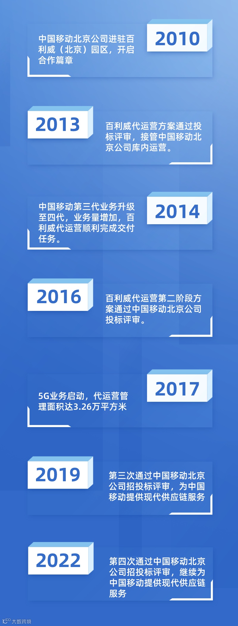 2022年9月,百利威集团通过中国移动北京公司招投标评审,再次成为其现代供应链服务合作方,双方自2010年至今已连续合作十二年时间。