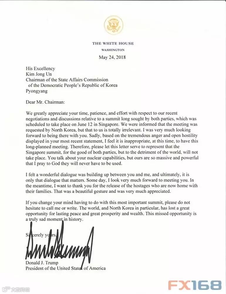 特朗普在信中写道:“你谈论的是你的核能力,但我们的能力是如此巨大和强大,我向上帝祈祷,它们永远都不会被使用。”特朗普还表示,峰会取消“错失了良机”,是“历史上非常悲伤的时刻”。