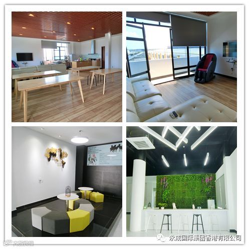 一期工程中的四层办公楼也设计得非常美。狼性文化宣传随时可见。员工福利也新增了员工图书馆、咖啡吧休闲区、按摩椅、私家篮球场等。
