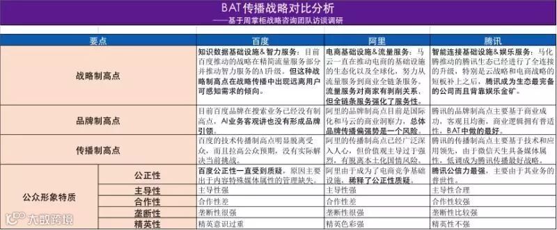 如图:《BAT战略传播策略对比分析》,全面展现了BAT公关战略和公司战略的关系: