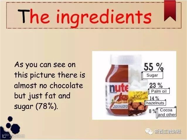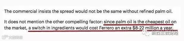据悉,精炼棕榈油是市面上最便宜的油,若费列罗公司将Nutella巧克力酱中的棕榈油换成别的食用油,每年会增加约合900万到2500万纽币的成本支出。