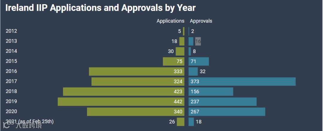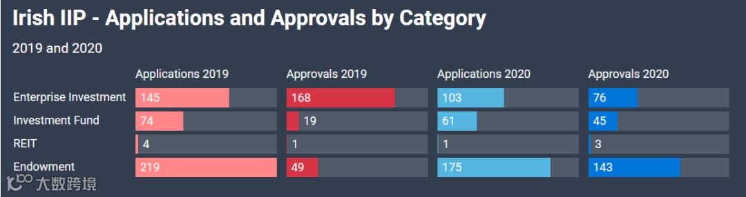 2021年2月25日,爱尔兰司法部自2009年以来,首次公布爱尔兰投资居留项目的申请量、批准量以及投资额数据。数据显示,尽管受疫情影响,2020年接收的申请量较前一年下降了23%,从442宗降至340宗,但获批量提高了13%,从237宗升至267宗。这也是有史以来第二高的年获批量。