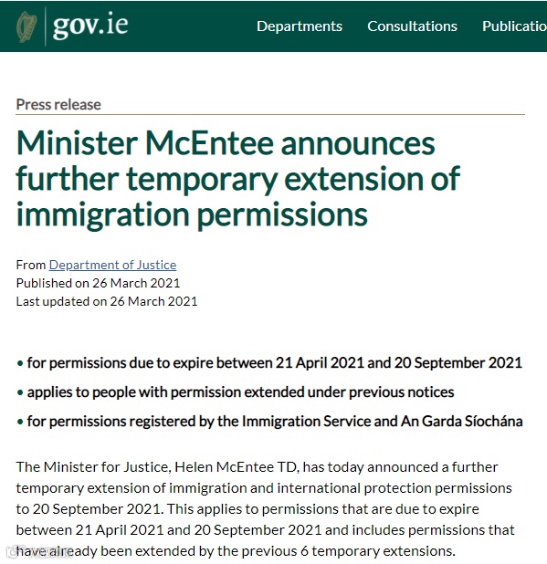 司法部长海伦·麦肯迪宣布,签证到期日将自动延长至2021年9月20日。这项政策适用于在2021年4月21日至2021年9月20日期间到期的签证许可,包括前6次被临时延期的许可。