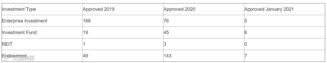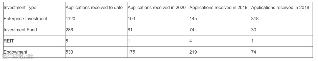 从2018年到现在,申请企业投资(Enterprise Investment)、基金投资(Investment Fund)、房地产信托基金投资(REIT)和慈善捐赠项目(Endowment)四种投资模式每年的申请量如下表: